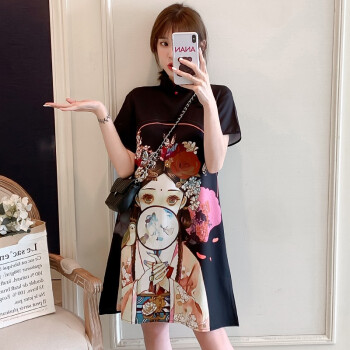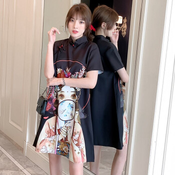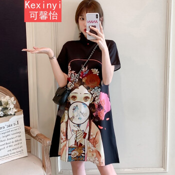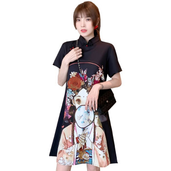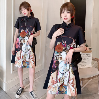 可馨怡 大码女装微胖mm连衣裙夏装旗袍改良胖妹妹加肥加大码胖人女装显瘦款遮肚肉裙子 黑色 XXXL(建议150-175斤左右) |