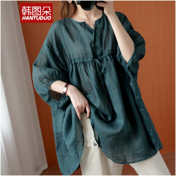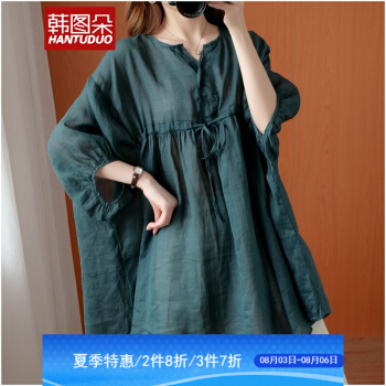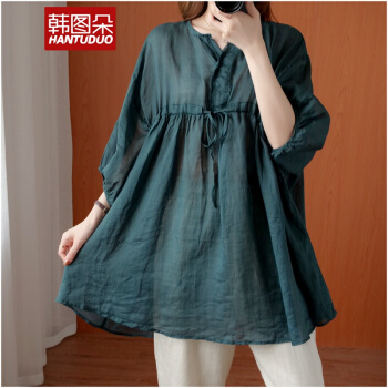 韩图朵胖妹妹mm大码衬衫女夏装新款棉麻衬衣短袖宽松上衣3068 墨绿色 大码均码 |