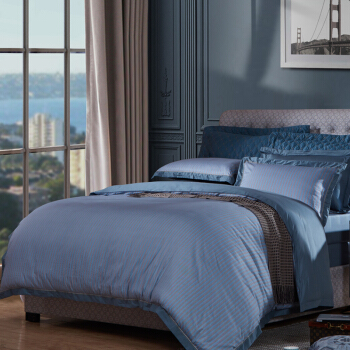 富安娜家纺 床上用品四件套纯棉全棉床品套件床单被套 中性条纹简约单双人射手座1米8/2米床(230*229cm)蓝色 |