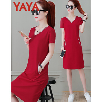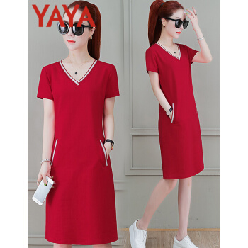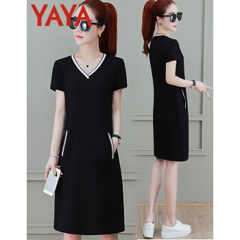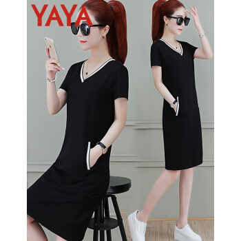 鸭鸭服饰(yaya)休闲运动连衣裙女中长款夏季新款宽松显瘦短袖V领T恤衬衫裙时尚女装裙子女 黑色 请选择正确尺码 |