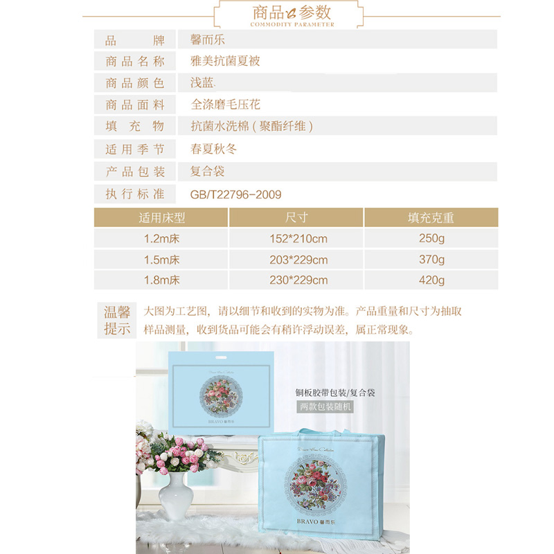 雅美抗菌夏被(夏被1件)(适合1.5米床)【面料:聚酯纤维;填充:聚酯纤维/浅蓝】 |
