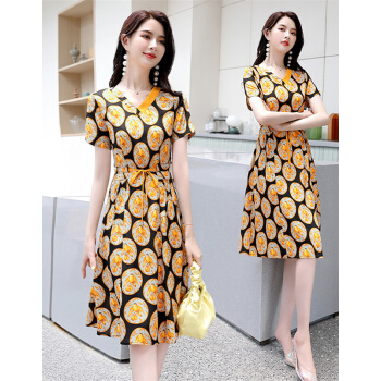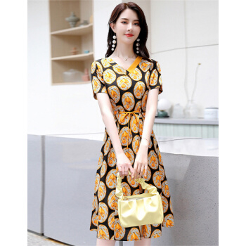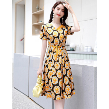 莺飞雪仿真丝连衣裙女夏季流行新款时尚条纹衬衫裙短袖夏天气质雪纺裙子 黑底黄 M(建议80-100斤) |