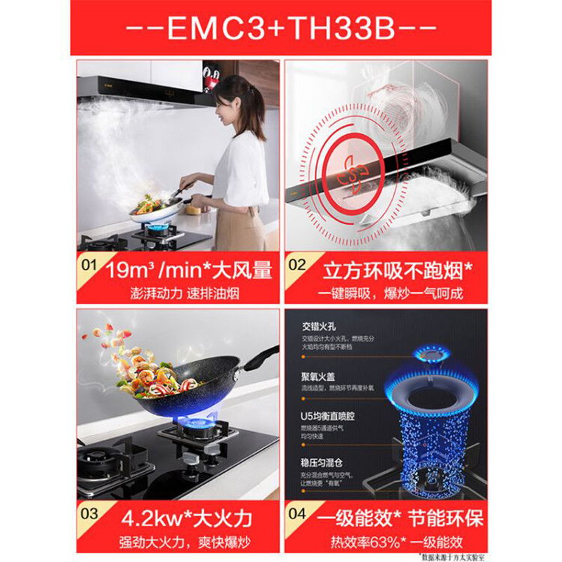 EMC2+TH33B 一键瞬吸 立方环吸 19m3/min大风量* 4.2KW*大火力 烟灶套装【钢化玻璃/黑色】 |