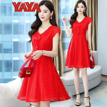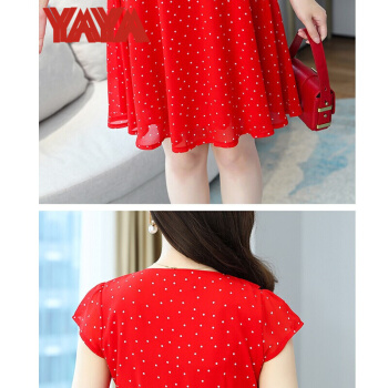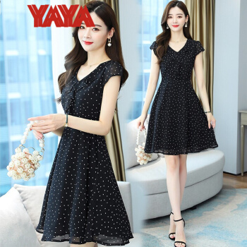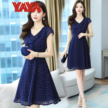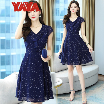 鸭鸭服饰(yaya)波点雪纺连衣裙女女装夏季新款v领短袖荷叶边气质裙子女夏 蓝色 请选择正确尺码 |