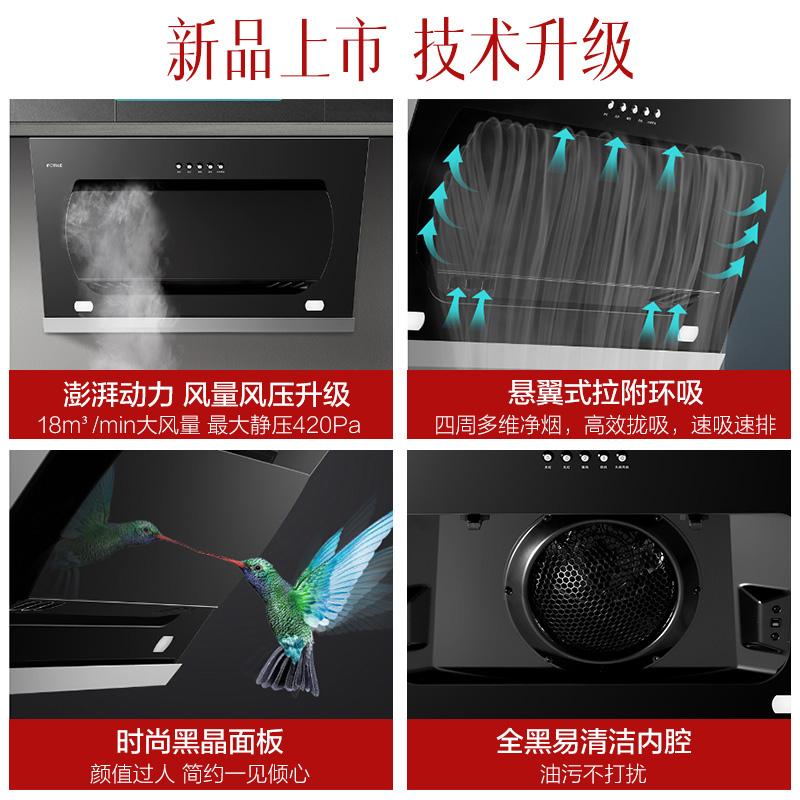 JCD8+FD23BE 悬翼式拉附环吸 18m3/min*大风量 4.1KW*大火力 烟灶套装【不锈钢+钢化玻璃/黑色】 |