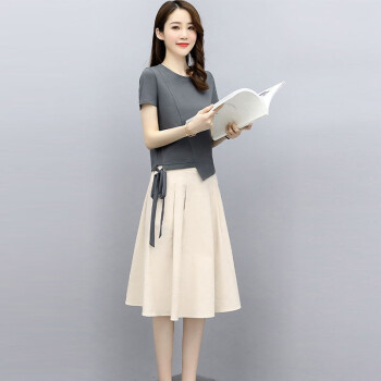 莱倪晟纳连衣裙新品女装夏季短袖时尚洋气宽松两件套中长款裙子 灰色上衣+米白裙子 请拍正确尺码 |