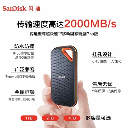 闪迪(SanDisk)2TB Nvme移动固态硬盘(PSSD)E81至尊超极速Pro升级版 高速传输2000MB/秒 IP55等级三防保护 |