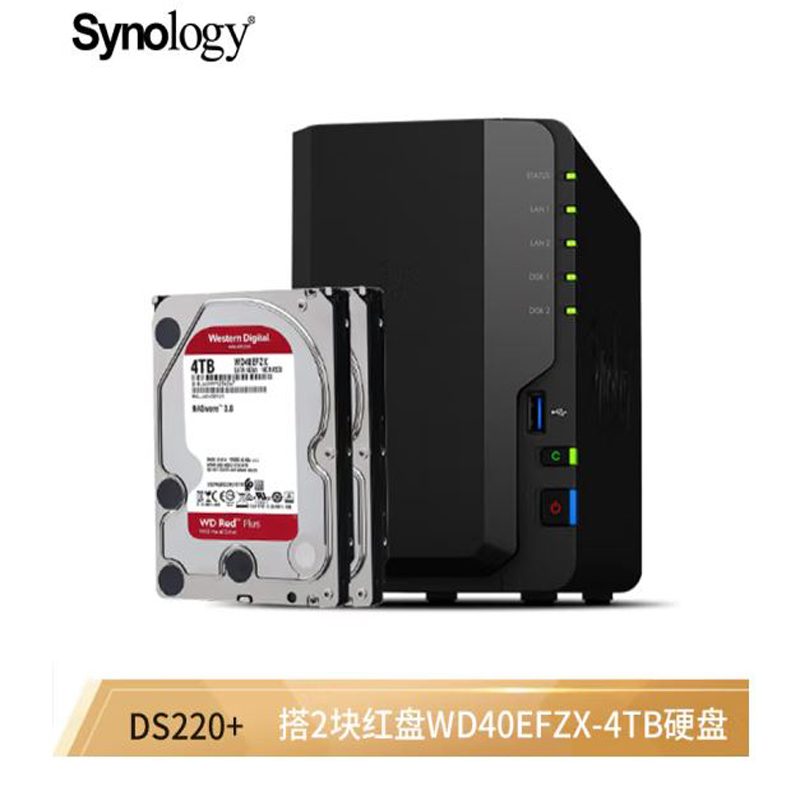 群晖(Synology) DS220+两盘位NAS 磁盘阵列网络存储服务器 个人私有云备份网盘 黑色 (配2块西数红盘Plus 4TB) |