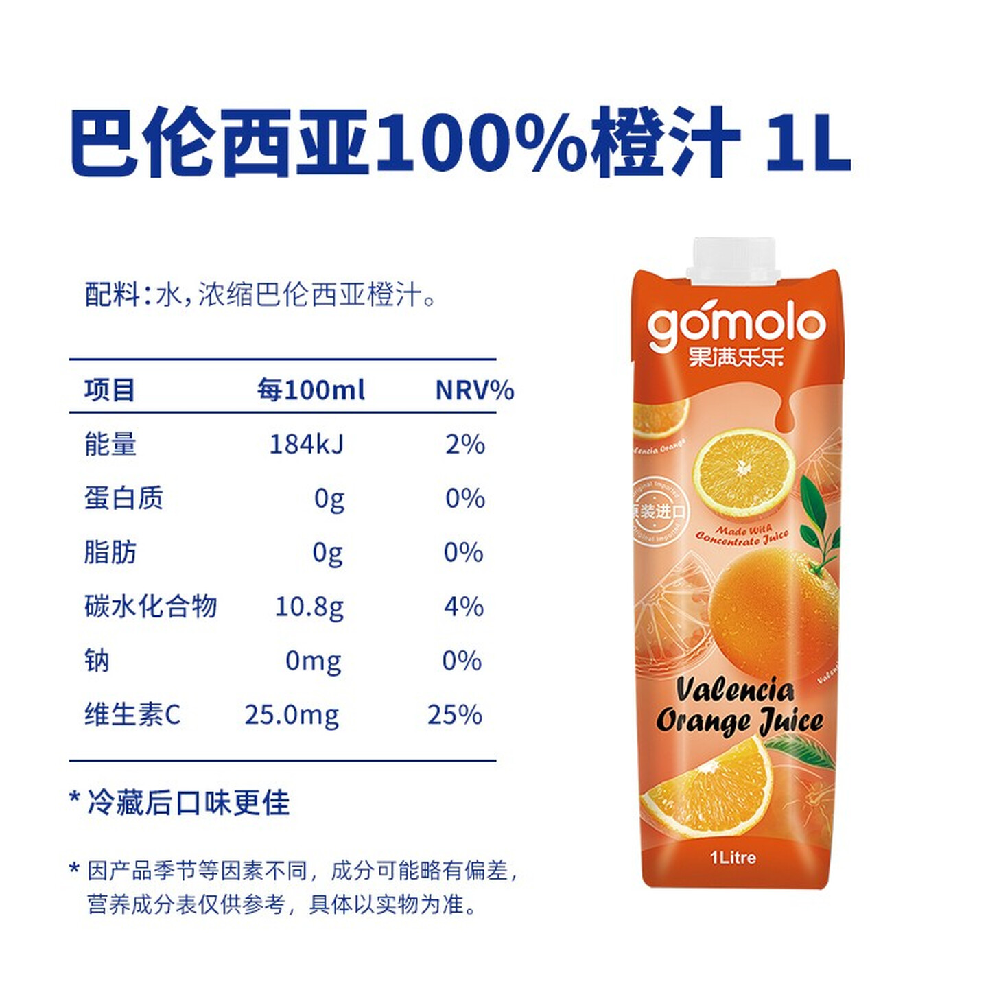 果满乐乐塞浦路斯进口巴伦西亚橙汁大瓶装100%纯果汁1L |
