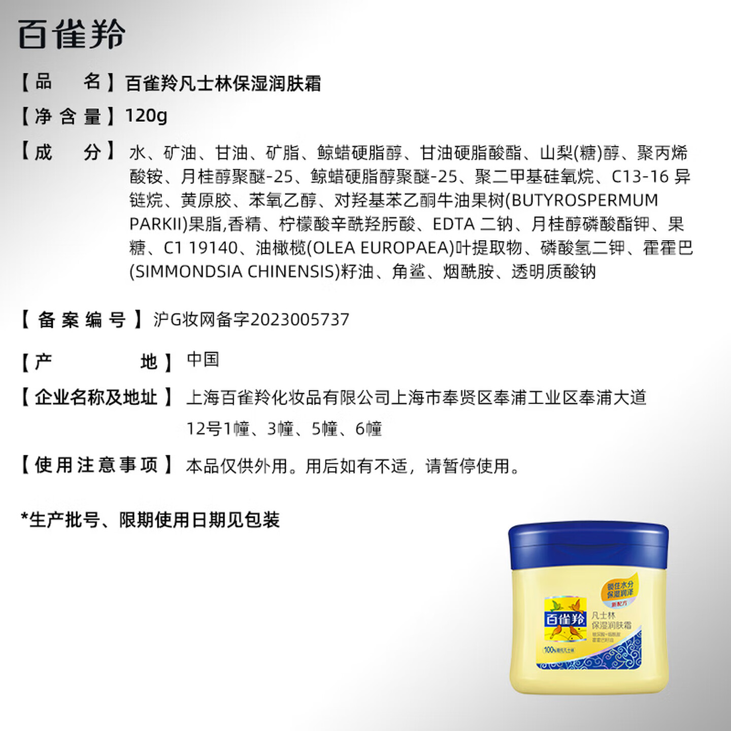 百雀羚经典凡士林保湿润肤霜120G脸手霜 |