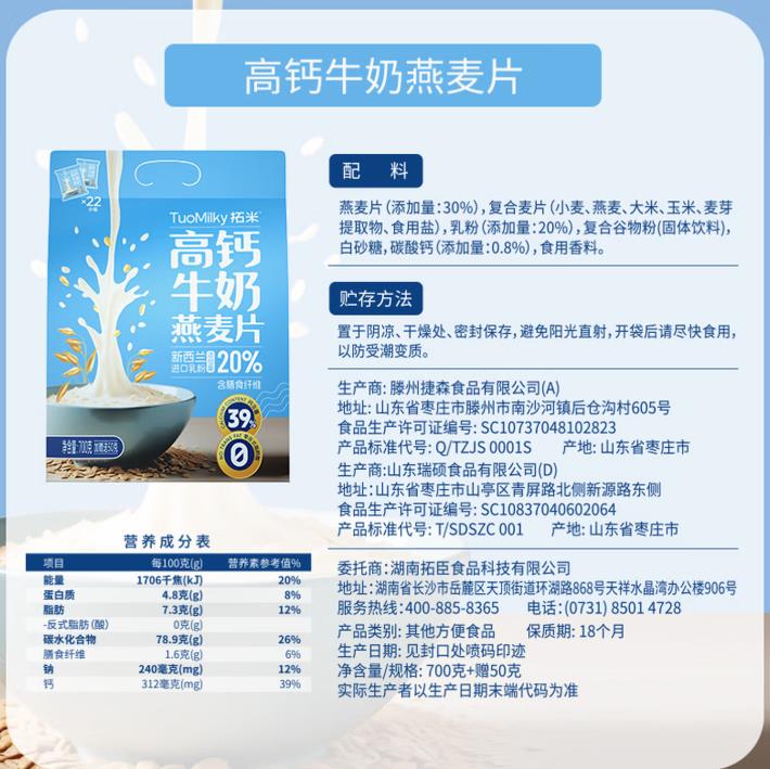 拓米高钙牛奶燕麦片700g |